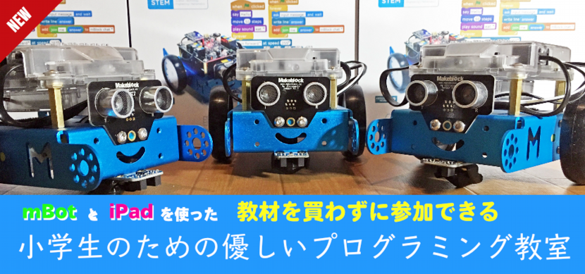 ・mBotとiPad1セットにつき、2人のチームで取り組みます。iPadを使ってmBotを動かすプログラムを覚えたり、プログラムを作ってmBotを動かしたりします。