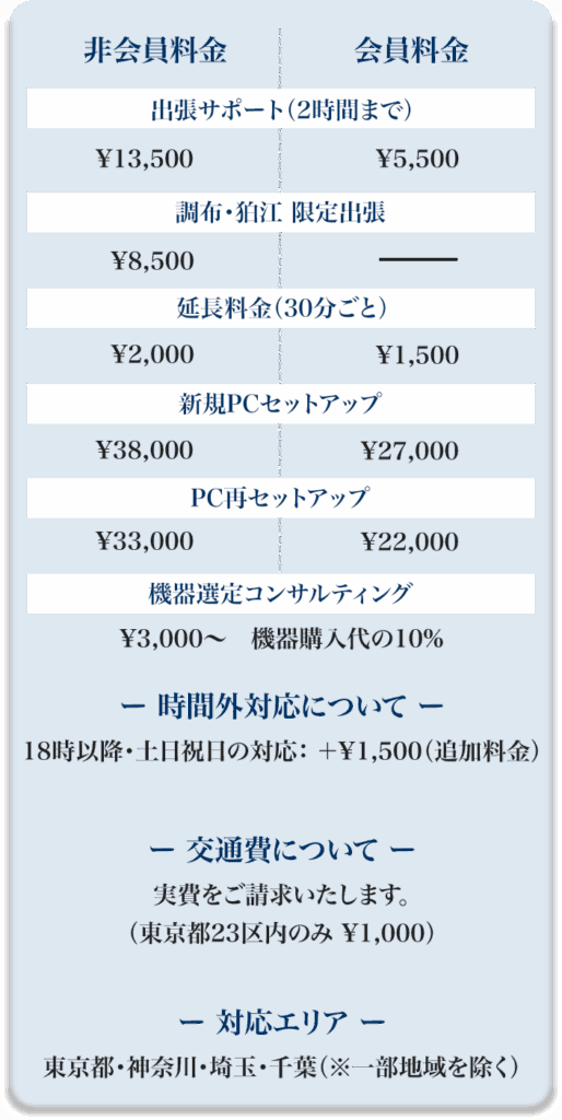 ー 交通費について ー実費をご請求いたします。(東京都23区内のみ ¥1,000)